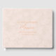 Skapa en fin bröllopssak att spara. Denna minnesbok ger din familj och dina vänner möjlighet att skriva meddelanden till bruden som hon kan läsa och minnas i många år framöver. Blommig design. Visad i persikans nyans rosa. Du kan ändra texten på framsidan och anpassa texten på sidopanelet. Använd mallen för att skapa din egen bröllopsgästbok med persikofärgade bokstäver till bruden.