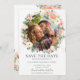 Framhäva ditt förlovningsfoto med detta eleganta blommiga spara datum-fotokort. Med en vacker akvarell persika, elfenben, rosa blommor och grönskande lövkrans. Anpassa det enkelt och snabbt med dina detaljer, tryck bara på knappen Anpassa för att ytterligare ändra och formatera stil och placering av texten.