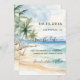 En vattenfärgad sandstrand, oceanen vågar och handflatan träd som bakgrund. Anpassa och lägg till ett datum och din namn. Texten: Spara datumet skrivs med ett stort trendig-handskript i stil.