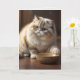 En flytande persisk katt med stort, uttrycksfullt ögon vilar tass på en träskål, sitta på ett polerat golv, tittar upprörd. Inre text kan ändras.