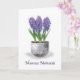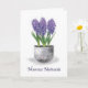 Tre lila hyacinter står i full blom i en kruka. Önska fred under det nya året med denna enkla men meningsfulla persiska hälsning, Nowruz Mobarak.