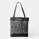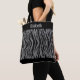 Personalisera denna svarta och grå-silver zebraprint dams shoppingväska, handväska med text på framsidan och olika eller samma text på baksidan. Bra gåvor till dina brudtjänster eller bröllopsgäster. Alla kvinnor skulle älska denna shoppingväska som en gåva.