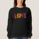 Perfect for cozying up in a reading nook, adding a pop of romance to your office attire, or keeping warm during a sunset stroll, this basic sweatshirt offers unparalleled visual clarity and comfort. The rich black canvas makes the vibrant, textured lettering stand out, ensuring that the message of love remains the focal point of your ensemble. Its versatile style transitions effortlessly from a relaxed nursery setting to a lively social gathering.