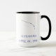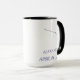 This premium two-tone mug combines a sleek white exterior with a sophisticated black interior and handle, creating the perfect backdrop for your cosmic identity. Featuring the Aries constellation in clean blue line art, it is personalized with your name and birth date for a truly unique touch.