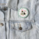 Girl's baby shower personalized Mommy to be button. Sweet baby girl sitting next to her little puppy dog in a patch of pretty watercolor flowers. Sage green and red wildflowers and butterflies background. Get one for each member of the family as a little baby shower favor gift.