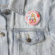 Girl's birthday party personalized birthday girl button with a cute watercolor squirrel wearing a birthday hat and a holding a gift illustration. The background is pink and red with a watercolor texture.