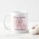 Celebrate a special birthday with this personalized pink coquette birthday mug, featuring a soft pink watercolor background with delicate line art bow and hearts. This custom name birthday mug allows you to add a name with “Happy Birthday” on the front, while the back includes space for a personalized message, making it a truly unique and meaningful gift.