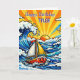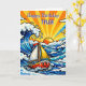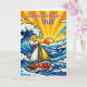 Personalized birthday card with a cute nautical pop art oceanic theme. Waves, a sun, sailboat and a shark blue, yellow and red pop art style graphics. Add name in the personalize area.