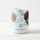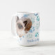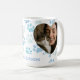 Celebrate the bond between you and your feline friends with this customizable photo mug. The design features a charming heart-shaped frame to showcase your favorite photos, surrounded by a playful pattern of blue sketched paw prints. Below the image, there is dedicated space to add a personalized name or custom text, making it a perfect keepsake or a thoughtful gift for any cat enthusiast.