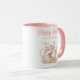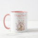 Celebrate Easter with this cute personalized mug featuring a sweet bunny peeks from a pink floral teapot, surrounded by pastel Easter eggs. Customize with your family name for a special touch. Perfect for your morning coffee or tea, this mug makes a wonderful gift for loved ones or a festive addition to your holiday decor.