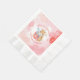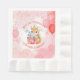 Girl's birthday party personalized paper napkins with a cute watercolor squirrel wearing a birthday hat and a holding a gift illustration. The background is pink and red with a watercolor texture. You can add your daughter's name and age in the personalize area.
