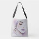 Carry beauty and elegance everywhere with this personalized tote bag featuring a sophisticated woman's face with lavender flowers and purple lips. The stunning design showcases a minimalist feminine beauty illustration with closed eyes, long dramatic lashes, perfectly sculpted brows, and striking purple ombre lips, gracefully holding a delicate lavender stem near her face. The soft pastel color palette of lavender purple, lilac, sage green, and gentle cream creates a serene, spa-like aesthetic that turns this practical tote into a beautiful fashion statement. Personalize with your custom name in elegant purple script to create a unique, one-of-a-kind bag that's truly yours.