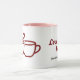 Personalize this charming mug with both your name and your partner's name. The design features two cozy coffee cups with a heart above them and the phrase "Love Brews Here" in handwritten burgundy script, perfect for couples who love coffee and each other.