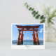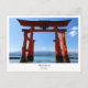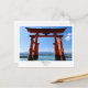 Celebrate the sacred beauty of Miyajima with this striking postcard featuring the iconic floating torii gate of Itsukushima Shrine. Painted in vivid vermilion and rising from tranquil waters, the gate stands as a timeless symbol of spiritual transition and architectural grace. Framed by distant mountains and a serene blue sky, this image captures the peaceful majesty of one of Japan’s most beloved landmarks.