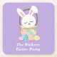 Customize this cute Happy Easter Bunny party paper coaster with your own personalized text with your child's name in white script. This adorable bunny rabbit sits in a pretty Easter basket on lovely pastel purple party decor for children.