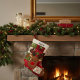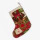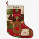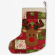 Personalized patchwork reindeer, This charming Christmas stocking features a festive patchwork design in shades of red, green, and cream, adorned with snowflakes and plaid patterns. A cute reindeer with a bright red nose is appliquéd on the front, bringing a touch of whimsy. The cuff is personalized with the name of your child in fun font making it a perfect, unique holiday decoration.