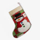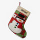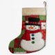 Personalized patchwork snowman. This charming Christmas stocking features a cheerful snowman design with a top hat and scarf. Its festive patchwork pattern incorporates classic red and green holiday motifs, perfect for adding a touch of country charm to your holiday decor.