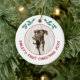 Celebrate your puppy's first Christmas with this charming personalized photo ornament. Add your own photo and change any of the text to customize. With pretty holly sprigs and modern script text in festive red, it beautifully showcases your favorite photograph of your dog, making it a perfect keepsake for pet lovers. Hang it on your tree to add a special touch to your holiday decor and cherish the memories for years to come.