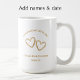 Add the couple's names and photo to this stylish golden 50th wedding anniversary mug. The golden tan simple, modern script is not real foil but faux gold. All the elegant typography is editable. Personalize this special photo keepsake coffee mug with the couples names and wedding anniversary date for a beautiful wedding anniversary gift. "Celebrating 50 Years" can be customized to any number for a 60th, 40th, 25th or any anniversary year. I created these hand drawn hearts for your keepsake 50th wedding anniversary gift. The two unique copper golden hearts created with impressions of leaves and buds, add a romantic botanical touch. This would be a great party favor for a golden 50th anniversary party. The table would look great with these commemorative cups and my golden heart napkins and coasters. Explore my collection for matching etched wine glasses, napkins and coasters for easy, yet stylish and unique custom party decorations.
