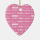 A pretty personalized heart shaped Christmas ornament gift gift for a little girl decorated in nine different fonts spelling your name in white. Cute customizable present with fun typography.