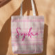 Cute personalized tote bag with soft pink plaid pattern and custom name in elegant script. Perfect for everyday use, shopping, school, travel, and casual outings. This reusable canvas tote makes a lovely gift for girls, teens, bridesmaids, birthdays, and anyone who loves aesthetic accessories with a personal touch.