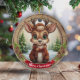 Personalized Rustic Xmas Pine Wood Decor. Framed Wooden Custom Deer Holiday Decoration. Personal Name Gift Tag. Whimsical Winter Wonderland Woodland Wildlife Deer with Antlers Character Ceramic Ornament! Featuring customizable white text saying "Merry Christmas" on a vibrant red ribbon – easily swap it out for a loved one's name to make a truly personal artwork for tree with charming accents of pine cones and evergreen branches for that cozy look. At the center is a festive reindeer in cartoon graphic style, dressed in a coat, hat and scarf, evoking the spirit of an animal with a cute twist. The background showcases an enchanting snow landscape complete with a snowy trees, capturing the joy of the season. This two-sided, personalizable pine wood artwork ensures seeing the adornment from every angle – illustration appears on both front and back, so it always looks complete no matter how it spins while hanging. Perfect for gifting or decorating, and you can transfer this unique design to a variety of other products, from mugs to cards and more! Personalize your pinecone embellishment and bring home this delightful keepsake today – visit Zazzle to customize and order now! 🦌🎄