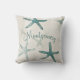 This coastal themed summer time throw pillow features watercolor starfish in various shades of sage green, from faint to deep, against a tan beige background on this beautiful double-sided cushion. Personalize with your family name in a playfully elegant script font arching slightly across the center in the deepest green of the darkest sea creature. The back of the beautiful custom cushion picks up the summer cream ivory for a background accented with a nautical compass in shades of green lifted from the starfish on the front. A modern serif font designates north, east, south and west on the compass points for a true maritime display.