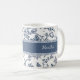 Add a touch of classic elegance to your home with this beautiful personalized ceramic mug. The design features a delicate blue and white pattern inspired by traditional Toile de Jouy fabric, adorned with botanical branches and subtle geometric lace borders. The central band offers space for complete customization. You can easily personalize this mug with a special date, a name, or a meaningful message, making it a wonderful housewarming, anniversary, or wedding gift.