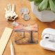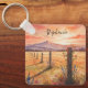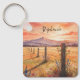 Carry serenity with this romantic keychain of a sunset landscape, showcasing pink, yellow, and blue wildflowers by a vine-covered fence, with purple mountains. Add your name or message for a sleek, custom touch, perfect for nature lovers.