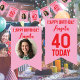 personlig 40-årsdag för henne i rosa och rött. Denna 40-årsbanderoll är perfektens party-banderoll för hennes 40-årsdag party. Du kan anpassa namn, ålder och foto för en anpassningsbar buntning.