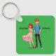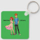 Den här fyrkantiga nyckelringen har en charmig anime-inspirerad illustration av ett ungt par mot en enfärgad persiko-rosa bakgrund. Flickan har kort rött och grönt hår och bär en flytande vit klänning med rosa foder och lila klackar och poserar med korslagda armar. Pojken har piggigt orange hår, bär en blå t-shirt, svarta byxor och blå sneakers och står med händerna i fickorna. Bilden är tryckt på ett tåligt fyrkantigt material, fäst vid en standard metall delad ring och kedja för enkel infästning på nycklar eller väskor. kan personanpassas med valfria namn