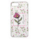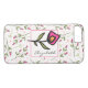 Ett telefonfodral med din skräddarsydda rosa för namn och söt i ett kvadratiskt ram med rosa gräns. Bakgrunden är ett mönster med vilda blommor av hand plockade rosa med långa gröntar och löv på en gulskvit färgad bakgrund. Rosa cirklar och spritar dekorerar också designen. Utformning av blommigt och söt.