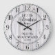 En rustik modern vitkalkt urtavla i lada med trägalleri och monogram, datum etablerat, samt frasen: "låt äventyret börja".