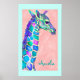 En baby-giraffe i blå och lila på mjuk rosa av korall. Du kan lägga till ett barns namn i ditt val av teckensnitt stil, färg och storlekt för en personlig för ditt barns rum. Även aqua gräns kan bytas ut mot ett annat färg för samordning med andra färger i rummet.