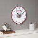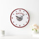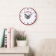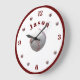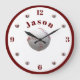 Personlig baseball-tema Stor klockdesign har bilden av en baseboll som mitten av designen. Siffrorna 12, 3, 6 och 9 visas i en burgunderfärg, alla andra siffror visas med mini-basebollar. Barnets namn visas i en halvcirkel ovanför mittbilden i samma burgunderfärg. Hela designen är inringad av en burgunderkant.