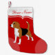 Personlig Beagle Hund Julstrumpa: Denna personliga julstrumpa är perfekt för Beagle-älskare. Den röda strumpan har en tryckt vit krage med röd text för att anpassa. Hunddesignen visar en tan, svart och vit Beagle hund som står alert och stolt.