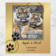 Bröllop vin-etikett med två tigrar på guld med stiliserad bakgrund med sött tass avtryck. Vacker för ett afrikanskt eller asiatiskt inspirerat firande, en djurpark eller safari bröllop eller ett djurtemat firande.