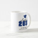 En snygg och modern examenspresent i form av en mugg med en examensmössa i blå färg högst upp, med ”Class of” och året strax under. Namnet på den examinerade och skolan visas under i rena och eleganta typsnitt, vilket skapar en polerad och stilren design. Designen löper runt muggen på två sidor, vilket gör att den ser bra ut från alla vinklar.