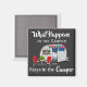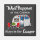 En magnet i roligten med en söt videokamera och meddelandet "What Happens in the Camper...Stays in the Camper" Lägg till namn för att signera för anpassning.