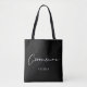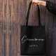 Denna eleganta, enkla svarta totebag för bröllopsgäst har ditt namn under elegant vit typografi. Anpassa dessa eleganta, moderna bröllopspresenter för dina bröllopsmän för möhippan.