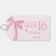 Lägg till en elegant finish på din fest med denna Sweet 16-tackfavorit-tag, med en mjuk rosa vattenfärgsknutt och tidlös typografi. Designad för att tacka gästerna för att de firar denna speciella milstolpe, är denna personliga tagg perfekt för att knyta på förmånspåsar, presentlådor, flaskor eller festminnen.