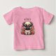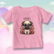 Cute chibi tecknad mysigt liten pug-valpen hund i rosa blommor med en namn som du kan lägga till i individområdet.