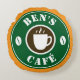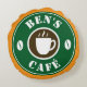 Personlig dekorationskudde för kafé. Rund design med kaffebönor och kopp. Anpassa med företagsnamn, anställdas namn, baristas namn eller kafé/ bar-namn. Gröna och bruna färger. Trendig heminredning för kaféets lounge. Orange eller anpassad bakgrundsfärg.