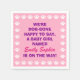 Den pappra servetten visningar rosa med vit tass avtryck och texten "Vi är hund-borta lycklig, för att säga, en flicka som heter [baby] är på väg! De här blöjorna är underbara artiklar för tassutskrift, tema för hund, upphettad matta eller djurmatade babyduschar.