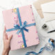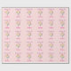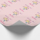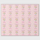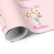 Rosa presentpapper. Ett upprepat mönster av en tecknad flicka med blondt hår, rosiga kinder och en söt leende. Hon har en blå klänning med rosa spetsbesättnad och blå skor. Hon håller en liten bukett blommor i handen och är omgiven av fjärilar och röda hjärtan. Ovanför henne står den lila texten "Födelsedagsflicka" och nedanför finns en mall att använda för att lägga till namnet du väljer genom att ersätta exempelnamnet.