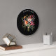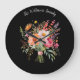 Lägg den här söten till väggen för elegans och blommigt stil. Klockan illustreras med en handbunden bukett av färska sommarblommor, på en kontrasterande svart bakgrund. Klockslaget kan vara personlig med en namn eller annan text som du väljer, i elegantens skripttypografi. En idealisk gåva till köket och hem i land i stil.