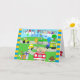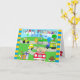 Det här söta handritade kortet visar en liten pojke och flicka som åker i en bil med ett allmänt pojktema med verktyg, traktorer, lastbilar och bilar.