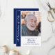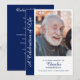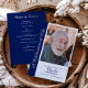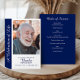 Personligt minnesprogram för firande av livet med foto är en hjärtlig och elegant souvenir utformad för att hedra minnet av en nära och kära. Detta anpassade begravningsprogram har ett stort foton på framsidan som ramas in av en marinblå sidopanel med orden ”Ett firande av livet” i ett graciöst typsnitt, tillsammans med anpassningsbar text för namn, datum och tributrad. Inuti presenteras en tydligt strukturerad ordning för ceremonin, visad på en rik marinblå bakgrund med vit text för en slående och värdig kontrast. Denna design balanserar modern stil med traditionella element och ger en polerad och tidlös tribut. Perfekt för begravningar, minnesstunder eller minnesfiranden, fungerar detta program både som en funktionell guide för ceremonin och som en bestående souvenir för familj och vänner. Den framträdande fotovisning säkerställer att den avlidne står i centrum, medan layouten ger gott om utrymme för meningsfulla detaljer som hymner, läsningar och familjetribut. Oavsett om det delas med gäster, behålls som minne eller bevaras i familjearkiv, är detta personliga program ett genomtänkt sätt att fira ett liv som levts väl och att bevara kärbara minnen. Den marinblå och vita färgskalan tillför sofistikation och värme, vilket gör det till ett idealiskt val för att skapa ett personligt och vär