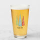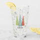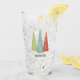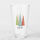 Lägg till ditt namn om du vill skapa en personlig med ett jultema. Pulvglaset eller pintglaset illustrerar tre Julgranar i ett elegant, modernt stil i ljust grönt, ljusblått och rött. Ditt namn eller annan text visas nedan med moderna svarta bokstäver. Bilden och texten visas på båda sidor av glaset.