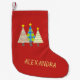 Gör julaftonsmorgonen extra speciell med denna söta röda julstrumpa med tre fantasifulla julgranar i mönster och ett eget namn i en lekfull stil. Perfekt storlek för små presenter, godsaker och överraskningar, denna personliga julstrumpa tillför charm till din juldekoration.